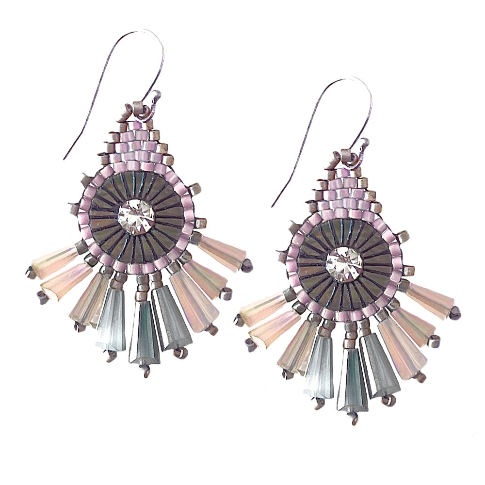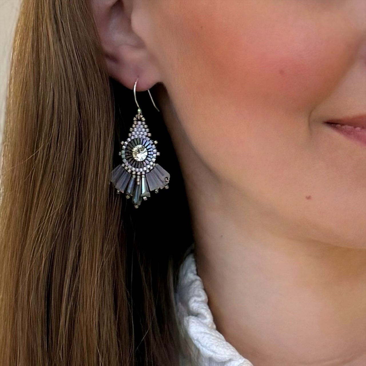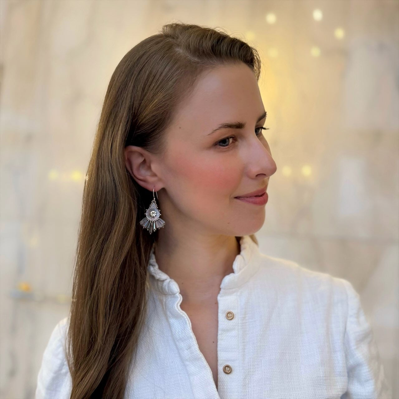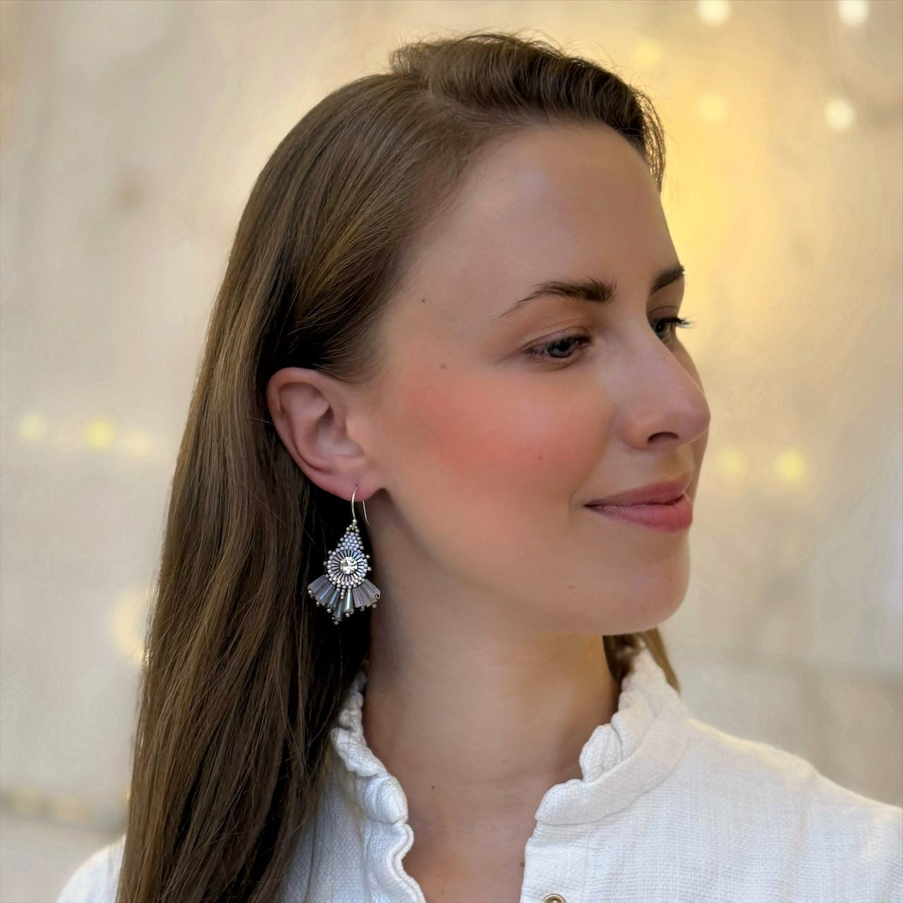 Schimmernde Glaskristalle und Rocailles werden in Wien sorgfältig per Hand gefasst. Nickelfreie Stecker sorgen für angenehmen Tragekomfort.